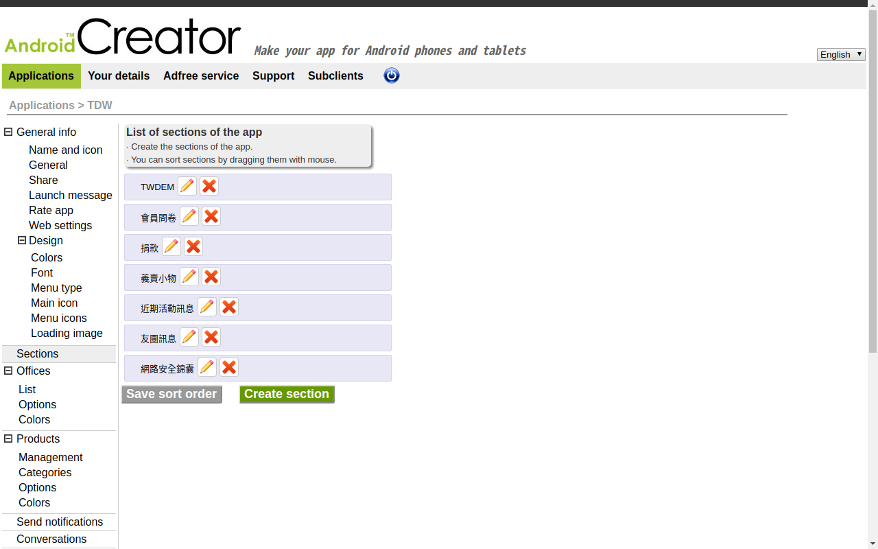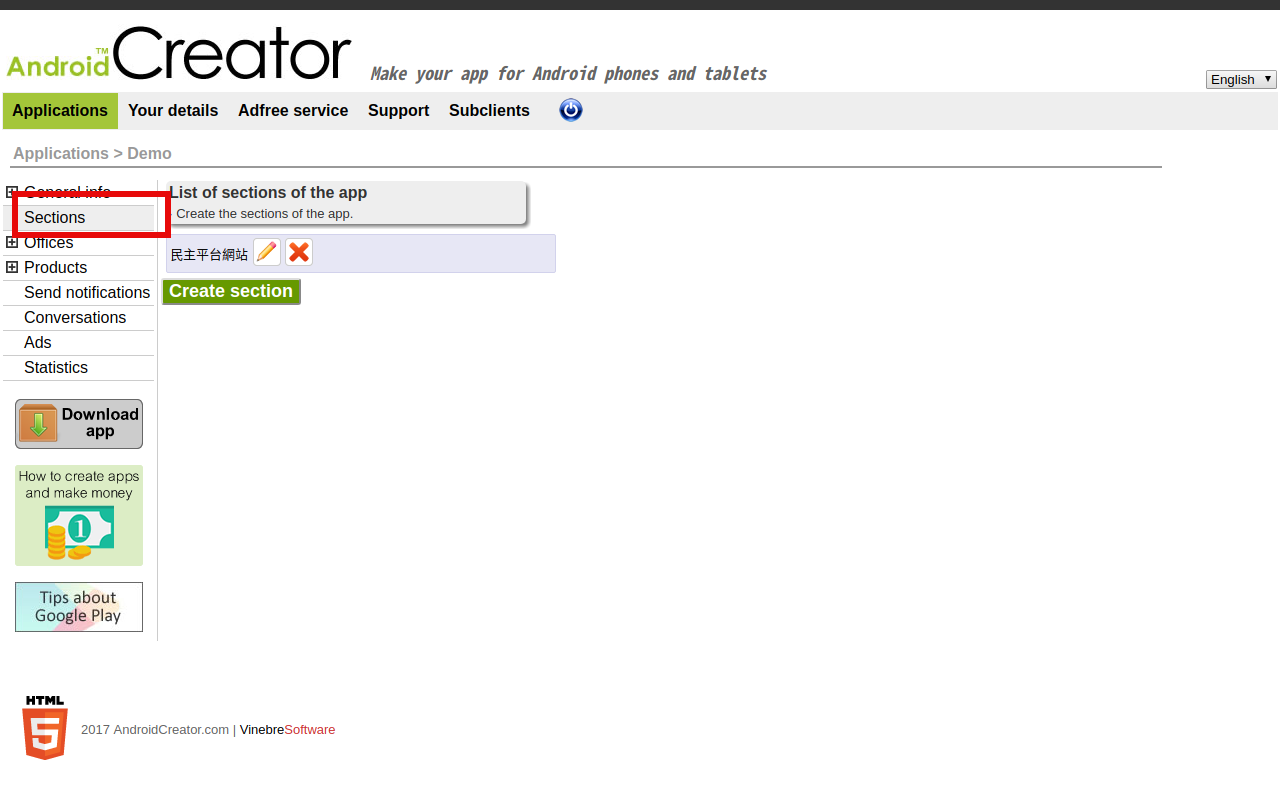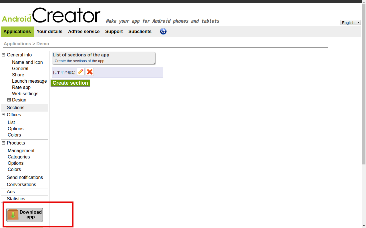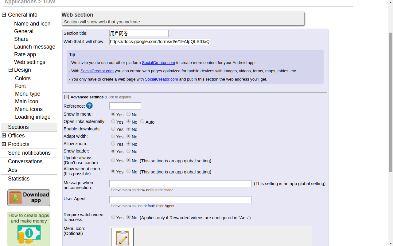 接下來的任務是對目前僅提供一行網址的 app,如何修改強化其功能內容。一樣是在登入後,挑選欲進行更動的 app,左側即是它的「工作選單區」。其中最常會使用到的,就是"sections",它的作用就是會出現在手機應用「選單(menu)」底下的各式內容。新建一組 section 就可以為原本只有一個網站連結的 app 增加放入其它內容(功能)。選擇「Create section」按鈕後,會引導進入到各種功能選項,就有點類似上述新手入門 step 3 的步驟再重覆一次。換言之,在這款手機應用中可以包含多個網站,影片或文字等等內容。section 底下的進階設定(Advanced setting),則是可以再稍微調整此部份在手機上顯示的效果,例如是否為它新增一個小圖標或是用戶必須透過外部瀏覧器來開啟此內容等等。