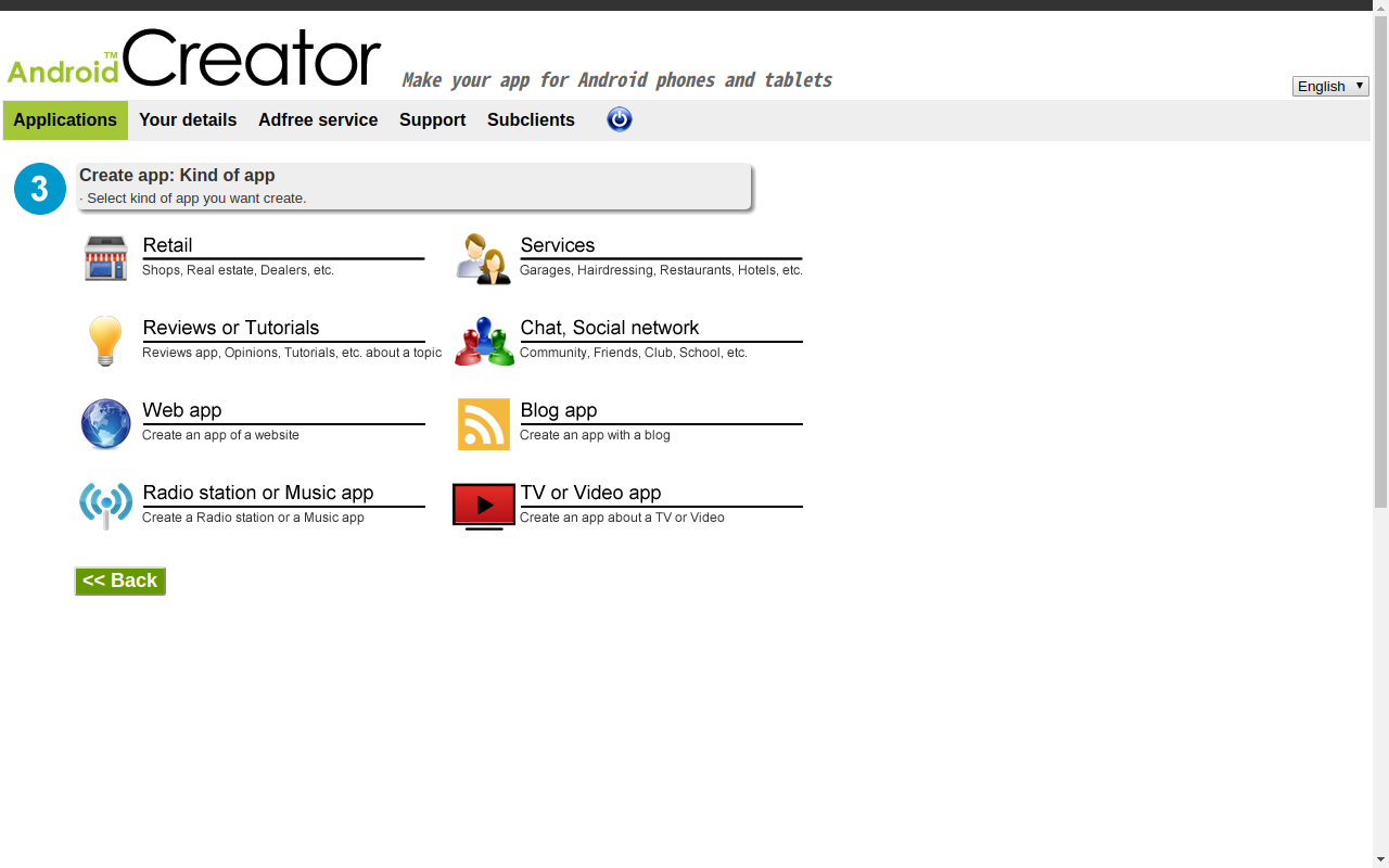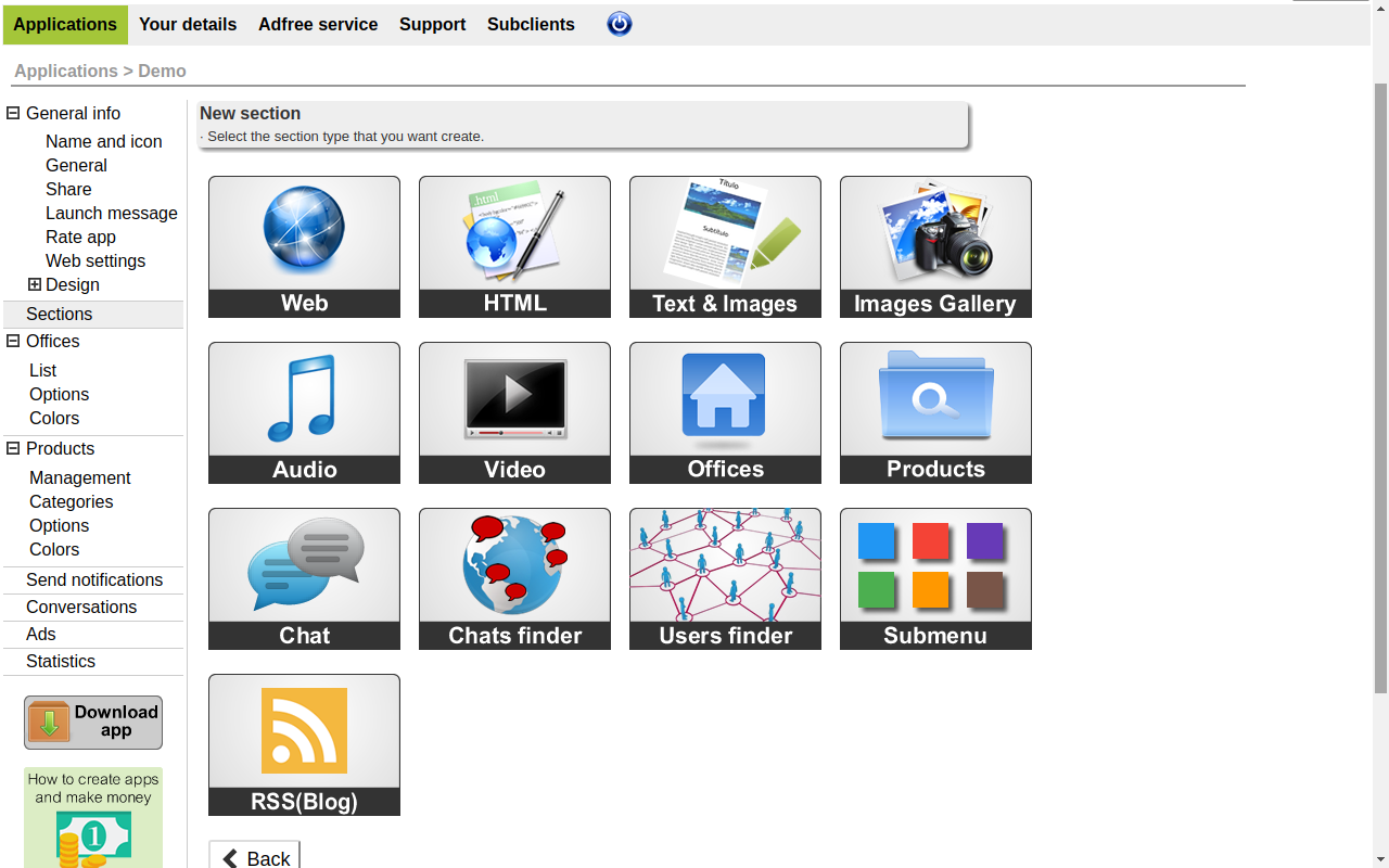 step 3. 接下來出現的畫面是詢問這款手機應用的功能作用是什麼,目前它大約提供的服務就是以下這八大項。建議新手測試,可先挑 web app 選項,因為它只需填入只需一個網址資訊即可。基本上這樣就算結束了(茶)。AC 會接手下來的任務,在三分鐘內把 apk 檔案做好,並讓用戶可在左側欄位中的「Download app」地方下載此應用程式檔案。