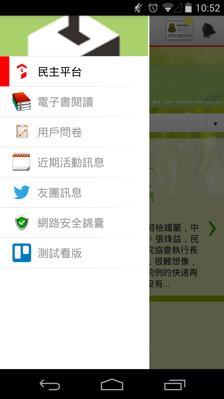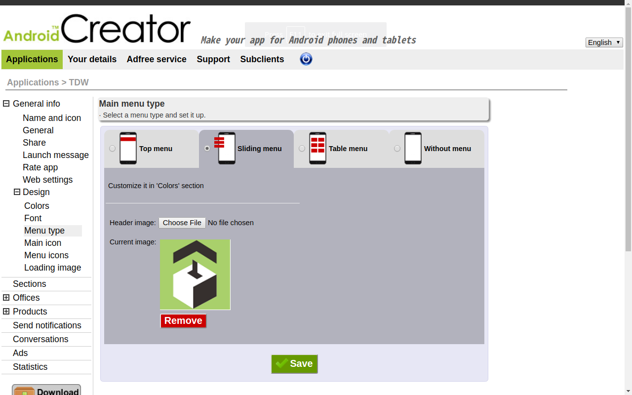 再回來看左側的選項,可以在"General info"底下的“Design”,可以為手機應用的樣式再做一些調整修改。以「Menu type」為示範,AC 僅提供:Top, Sliding, Table, Without menu 四種選擇。下方第二圖即為「滑動側欄」(Sliding)的選單呈現模樣,而第三圖則為 Table。