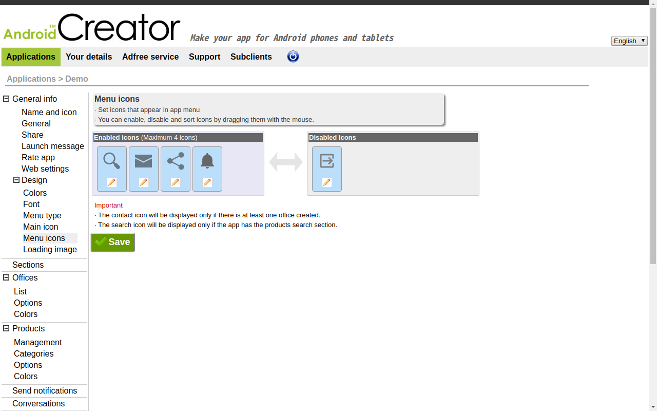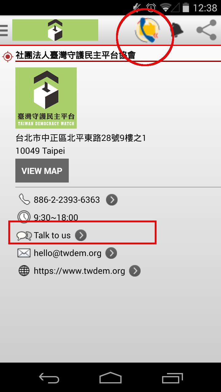 介紹完基本的新建 section、圖示色彩變動後,接下來介紹 office、products 二個區塊。說穿了,office 就是辦公室地址和連絡方式,若有輸入 office 資料,則安裝用戶在手機主選單上按「聯絡功能」小圖示後,可以直接快速撥打此辦公室的電話,透過此軟體傳免費訊息給原軟體製作管理員(雙方可在 androidcreator.com 進行文字傳訊聊天)