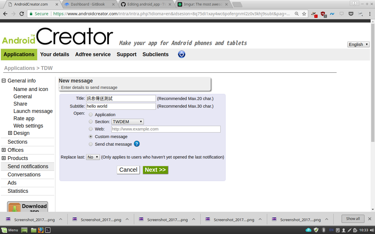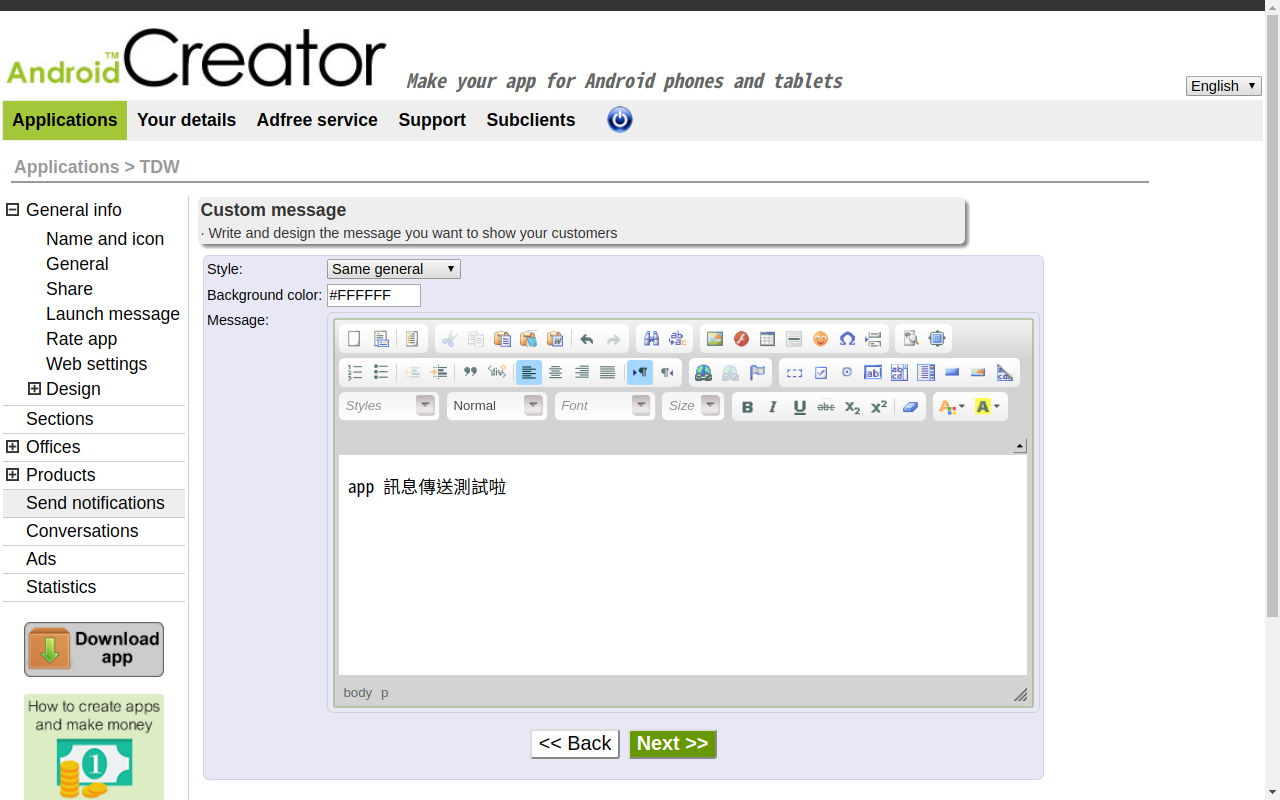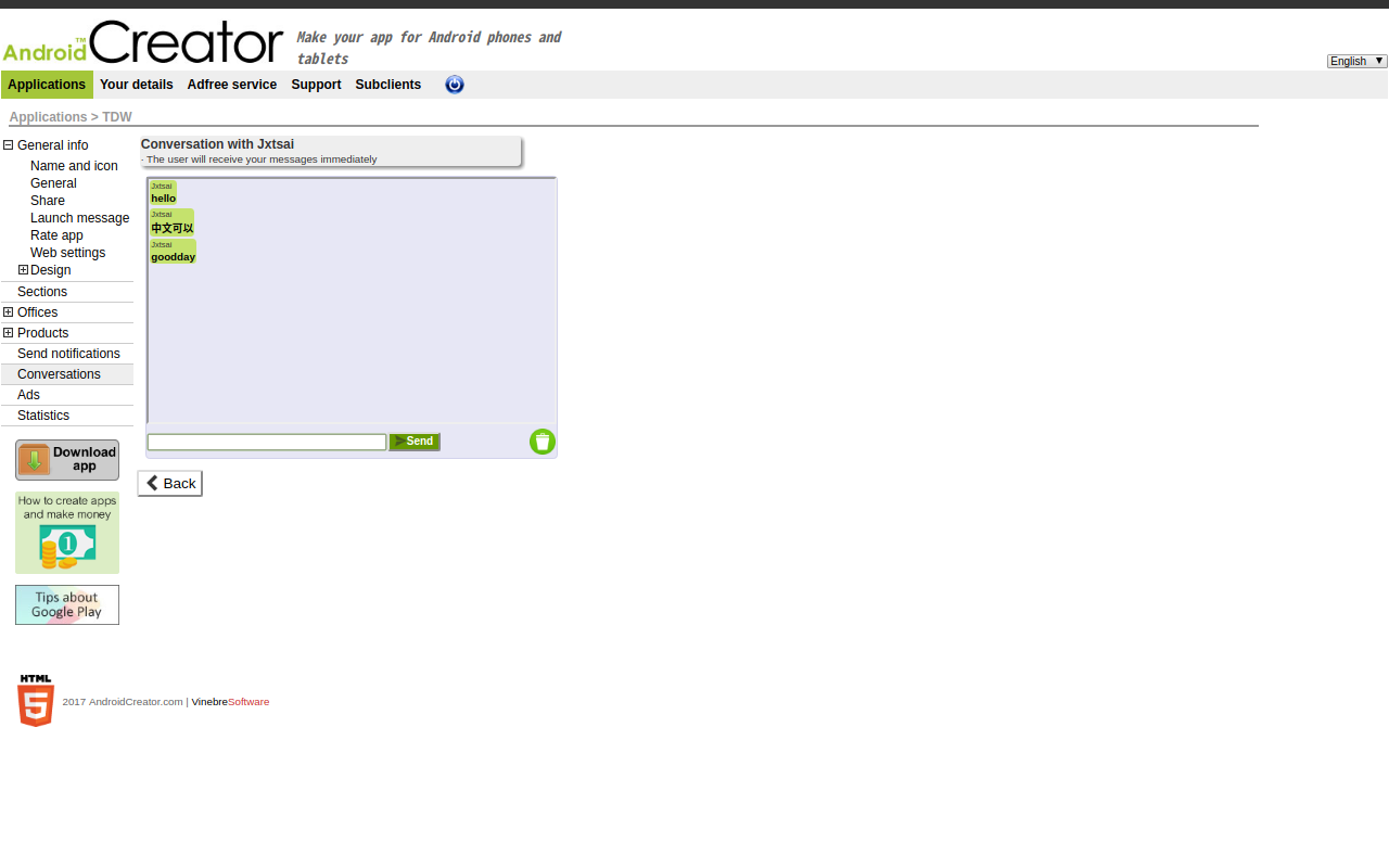 最後二個功能:Send notifications,Conversations,後者是在稍早 office 部份提過,讓安裝者可以在此應用上,利用與「辦公室」、「營業處」的聯絡資料,和原軟體製作管理員進行線上文字通訊,雙方的對話記錄即可在此找到。(同時 AC 也會發信到開發者註冊時提供的電郵信箱,通知開發者安裝用戶透過此 app 傳來了新訊息);Send notifications 則是可以讓開發者透過它,向安裝此應用的用戶發佈通知消息。