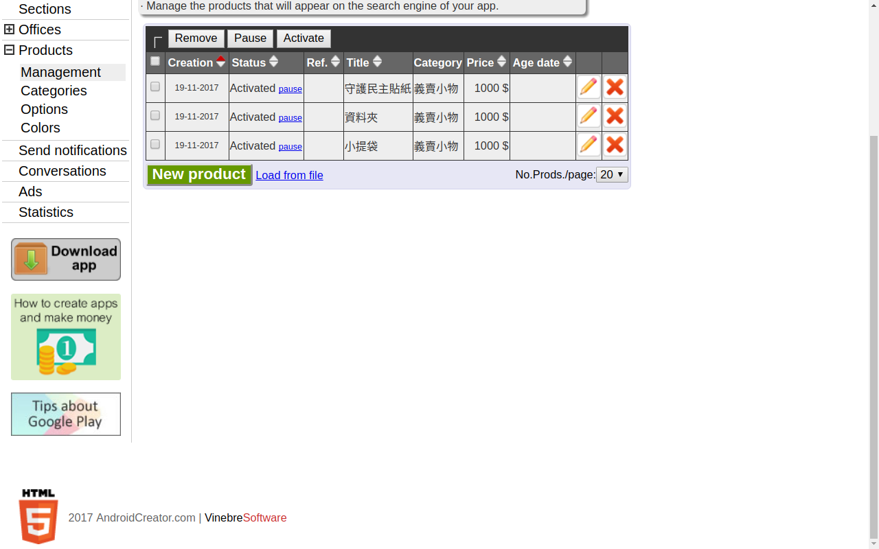 products 則一如其字面所表,指是商品產品,其作用是讓小電商或網拍商快速製作自己的網路商店 app。為了測試它的功能,故意放了一些東西看看。