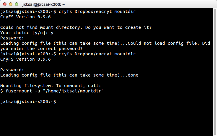 輸入完上述指令後,系統因為找不到moundir這個目錄,故會問我是否要在本地端建立一個mountdir目錄,然後接下來詢問我encryt密碼。我先故意輸入錯誤密碼,結果系統回覆說因密碼錯誤無法載入設定檔也無法解密encrypt目錄下的加密文件。