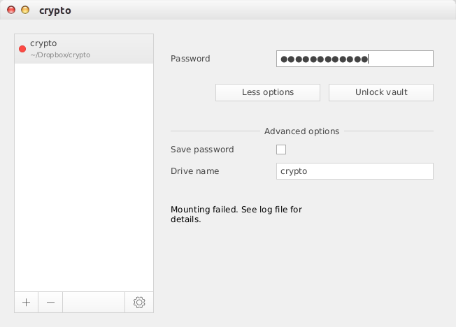 在原作業的電腦上可以在輸入主密碼後,解密保險庫中的檔案,正常地讀取其內容。但是當我在另一台電腦上實驗能否解密dropbox保險庫中的加密檔案,卻傳回了失敗無法掛載該磁區的訊息。也不知要去哪裏查log檔案找出錯誤。