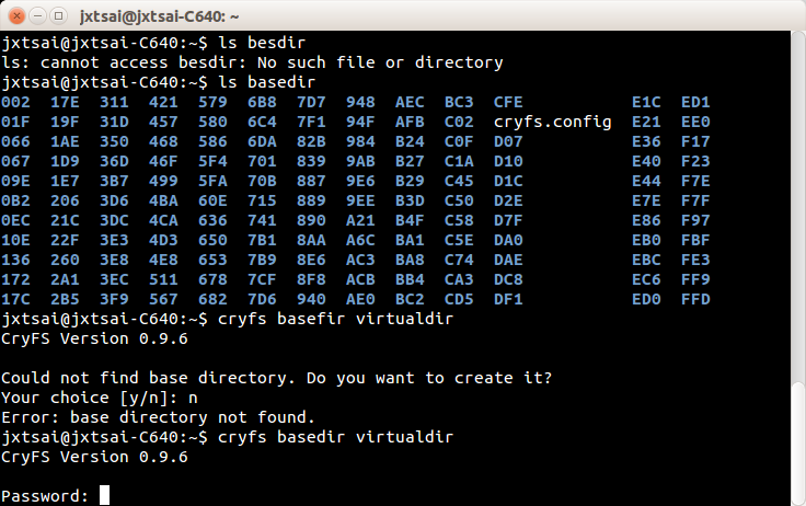 目前CryFS的操作主要以純文字介面為主,透過在cli環境下指令來建置欲加密檔案的存放目錄以及解密目錄。後者下指令建立後,cryfs會將其弄成一個「虛擬的目錄」,換言之,被搬移到存放目錄的檔案或資料夾在此會自動被加密,只能透過解密目錄的開啟來察看其內容。但因為它又是一個「虛擬目錄」,故即便電腦落入它人手中,也無法隨便開啟,得先要啟動cryfs還原掛載該虛擬目錄,再輸入主密碼來讀取其內容。