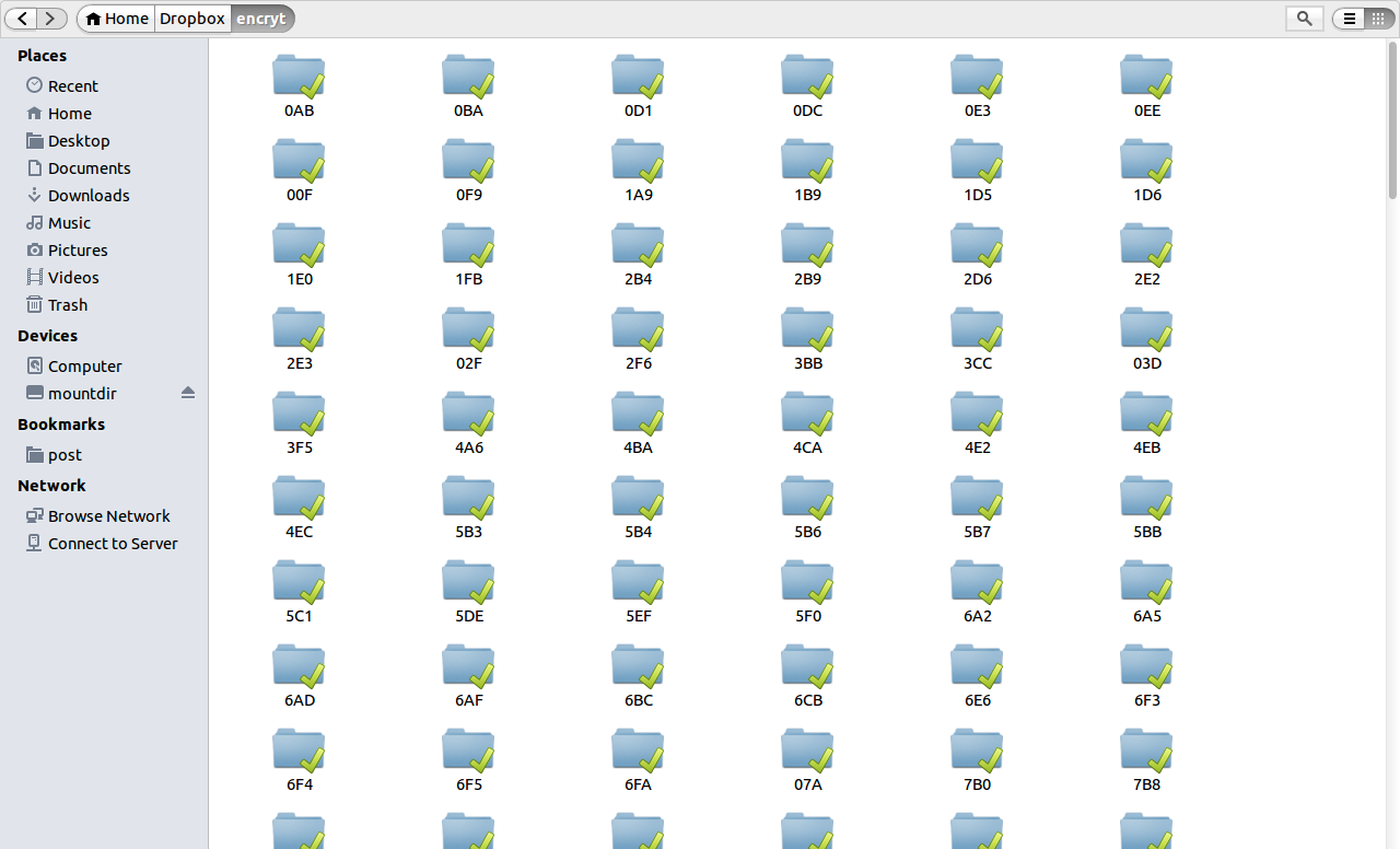 我自己先試著在第一台電腦上作了一個dropbox的加密資料夾,並放上經過CryFS加密後的檔案。所以一般人在這個加密的資料夾看到的檔案內容長得這個樣子:
