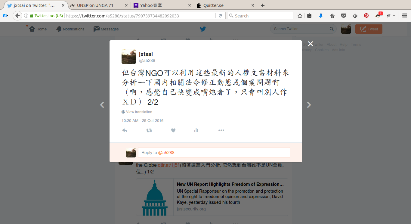 這個簡單網站的實質內容取材與方向是: 先把相關初步資料整理在這裏(https://unote.jxtsai.info) 目前在聯合國憲章人權保護特別程序下的幾個主題,應該是這幾個和台灣社會以及我個人興趣比較相關,然後會再陸續把台灣在這領域的近況資料補充進去,有能力地話會寫下個人觀點的觀察分析。如此算來,一年也不過要寫3~4篇文章,所以應該還好吧?
