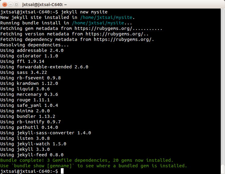 先前提假設,已經通過了ruby/gem安裝考驗,成功地在本機電腦端上裝設好了jekyll。故只要在命令列下新建網站專案指令: