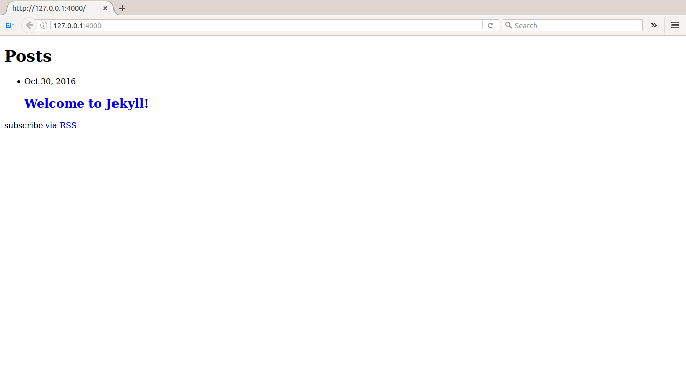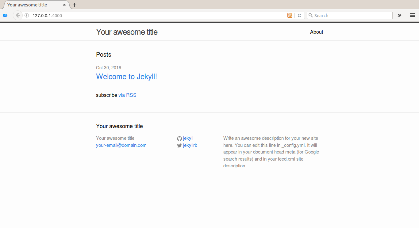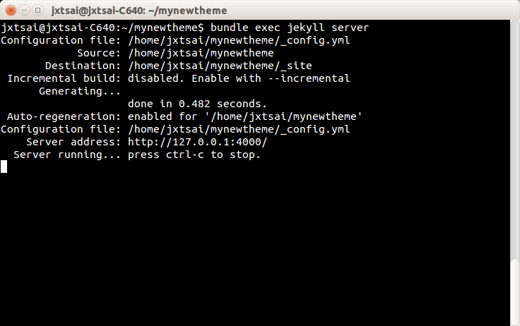 把「mysite」底下的東西全部複製搬移到「mynewtheme」底下,此時在「mynewtheme」的工作目錄下,再打入jekyll 伺服器指令mysite$bundle exec jekyll server,這時候會看到一個最原始還未加入任何CSS模版設計與圖片的初胚網站。