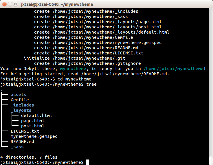 $jekyll new-theme mynewtheme #mynewtheme為自取的主題名稱